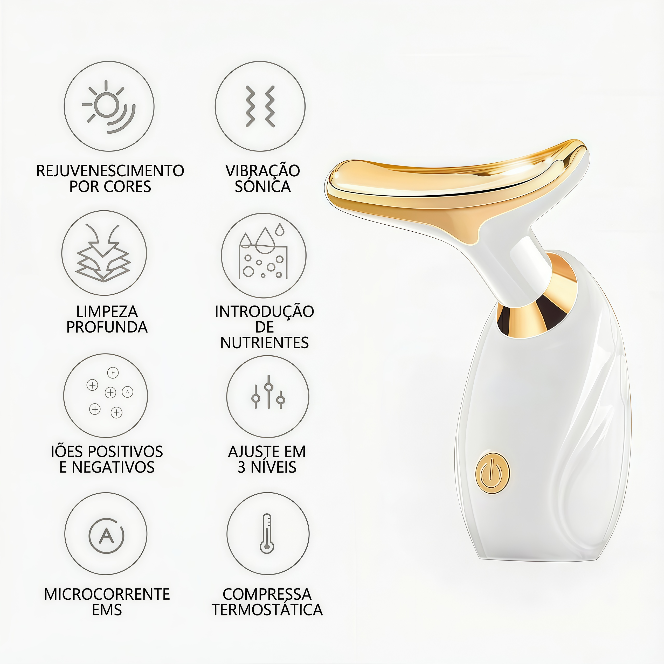 com o nosso dispositivo facial de microcorrente, você atende diferentes necessidades de beleza graças ao design 3 em 1 para lifting facial, massagem e relaxamento. O design excepcional garante portabilidade, facilidade de uso e firmeza da pele, para uma aparência mais jovem e revitalizada.